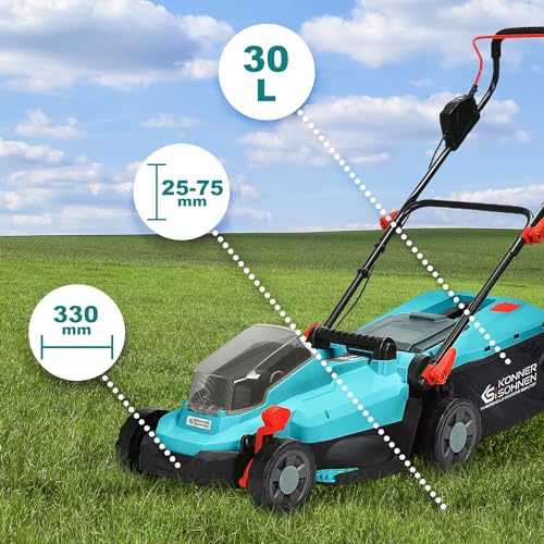 K&S Könner&Söhnen KS 33LM-20V Akku Rasenmäher 20 V, Schnittbreite 33 cm, Schnitthöhe 25–75 mm, Elektro rasenmäher mit 5 Positionen, mulchmäher mit Grasfangbox 30 l,Bürstenloser Motor,Mulchfunktion