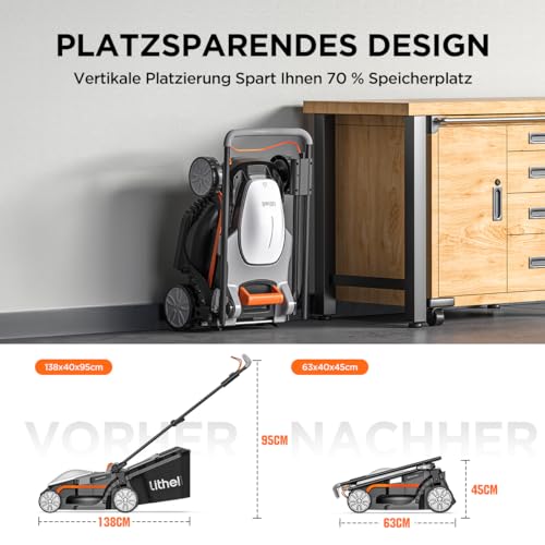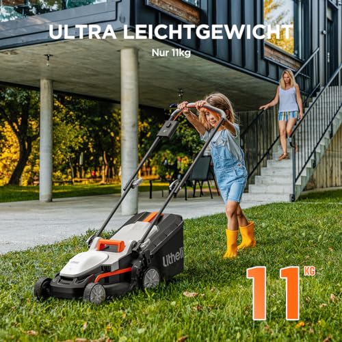 Der Litheli Akku-Rasenmäher lässt sich dank seines leichten Designs und des ergonomisch verstellbaren Griffs mühelos manövrieren. Besonders hervorzuheben ist der Tragegriff, der den Transport des Mähers noch einfacher macht.