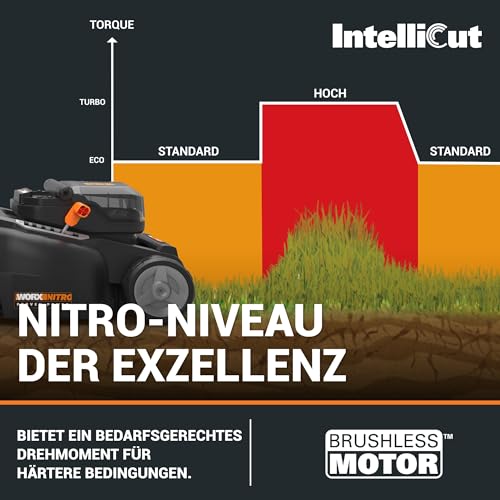 | Features | HOCHEFFIZIENTER BÜRSTENLOSER MOTOR 2.0: Der Nitro-Mäher bietet mehr Leistung und eine längere Laufzeit und ist so leistungsstark wie ein benzinbetriebener Mäher, ohne Geräusche und Lärm, ohne Schadstoffausstoß und mit höherer Kosteneffizienz. Er ist für das Mähen von Rasenflächen bis zu 500㎡ ausgelegt, INTELLICUT-TECHNOLOGIE: Die patentierte Intellicut-Technologie erhöht die Leistung, wenn das Gras dichter wird, und ermöglicht es Ihnen dann, die Leistung zu reduzieren, um den Akku zu schonen. Besser als je zuvor kann der neue Worx-NITRO-Rasenmäher den Intellicut automatisch ausführen, ohne dass Sie den Drehschalter verstellen müssen, EINFACHE EINSTELLUNG DER SCHNITTHÖHE: Mit einem einzigen Handgriff können Sie die richtige Höhe für verschiedene Jahreszeiten und Präferenzen ganz einfach einstellen. Dank der einstellbaren Schnitthöhe von 20 bis 70 mm ist er sowohl für kurzes als auch für hohes Gras geeignet und kann mühelos verschiedene Arbeitsanforderungen erfüllen, ERSTELLBARER KLAPPBARER HANDGRIFF: Der schnell verstellbare 6-Positionen-Griff ermöglicht es Ihnen, in der optimalen Position zu arbeiten und sorgt für mehr Komfort. Und mit den beiden Schnellverschlussknöpfen können Sie den langen Griff der Maschine in Sekundenschnelle einklappen. So lässt sich der Mäher viel einfacher transportieren und lagern, GLEICHER AKKU, ERWEITERBARE ENERGIE: Die intelligenten Worx Power Share PRO-Akkus bieten längere Laufzeiten sowie Hitze- und Stoßschutz. Kompatibel mit allen Worx 20V-, 40V- und 80V-Werkzeugen, Outdoor-Power und Lifestyle Produkten |