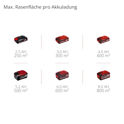| Features | Power X-Change – Der Akku-Rasenmäher RASARRO 36/34 (2×3,0Ah) ist Teil der Einhell Power X-Change Familie, in der Akkus, Ladegeräte und Systemgeräte kombiniert werden können., Für 300 m² – Der 36 V Akku-Rasenmäher mit einer Schnittbreite von 34 cm wird für Flächen bis 300 m² empfohlen., Variable Schnitthöhe – Die Schnitthöhe des Akku-Rasenmähers lässt sich 5-stufig, zentral zwischen 25 mm und 65 mm einstellen und individuell an jeden Rasen anpassen., Einfache Handhabung – Ein geringes Eigengewicht und der höhenverstellbare Führungsholm machen das Rasenmähen so komfortabel und rückenschonend wie möglich., Platzsparend – Dank des klappbaren Führungsholms lässt sich der Akku-Rasenmäher platzsparend verstauen. Der Tragegriff erleichtert zusätzlich den Transport zum Aufbewahrungsort., Grasfangkorb – Der Grasfangkorb kann bis zu 30 Liter Volumen fassen. Per Füllstandsanzeige ist leicht erkennbar, wann der Rasenschnitt entleert werden sollte., Inklusive Akkus – Der Einhell Akku-Rasenmäher RASARRO 36/34 (2×3,0Ah) wird mit zwei 3,0 Ah Plus Akkus und zwei Ladegeräten geliefert. |