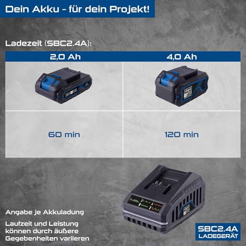 Scheppach 20V Starter-Kit bestehend aus 2Ah Akku & 2,4A Ladegerät (65W) | Lithium-Ionen-Akku | einsetzbar für Scheppach 20V-Serie | Ladezeit 2 Ah / 4 Ah Akku: 60/120 min | 3-stufige LED-Anzeige