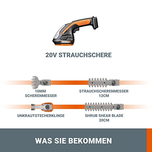 WORX WG801E.91 Heckenschere 20V – 4 in1 Multiwerkzeuge für Heckenschere, Rasenmäher, Heckenschneider und Schuppen – Einfacher Klingenwechsel – PowerShare kompatibel – ohne Akku & Ladegerät
