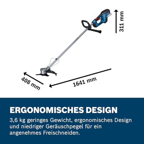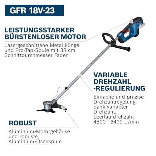 Bosch Professional 18V System Akku-Freischneider GFR 18V-23 (bürstenloser Motor, Schnittkreisdurchmesser 23 cm, 1x Fadenspuleneinheit, 1x Schultergurt, Freischneidermesser-Set, Pflanzenschutzbügel)