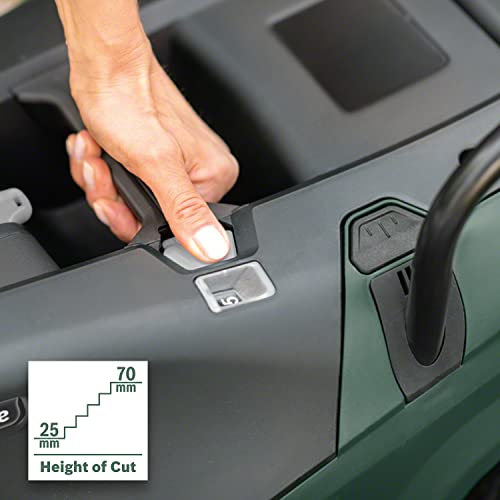 Zusätzlich ist das Einstellen der Schnitthöhe ein Kinderspiel: Ein einfacher Knopfdruck genügt, um die gewünschte Graslänge zwischen 25 und 70 mm zu bestimmen.