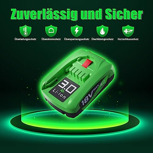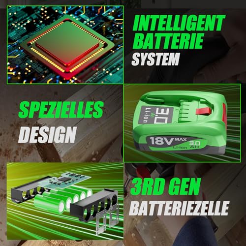 - Akku mit 18 Volt und 3000 mAh Kapazität für verlängerte Laufzeit
