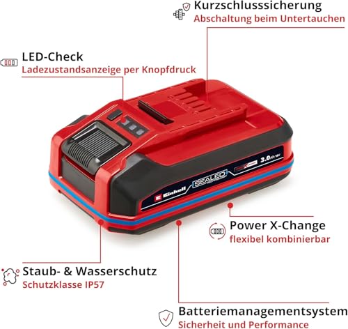 - Einhell Power X-Change 18V 3,0 Ah Akku mit Schutzklasse IP57 gegen Wasser und Staub