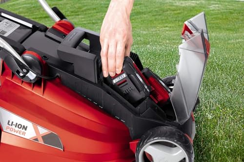 Das Herzstück des Einhell Mähers ist der leistungsstarke Power X-Change Systemakku. Er versorgt nicht nur diesen, sondern auch viele andere Geräte von Einhell, was Flexibilität und Nachhaltigkeit vereint. Der Mäher ist mit zwei 3,0 Ah-Akkus ausgestattet, die genug Kraft für Flächen bis zu 350 m² bieten.