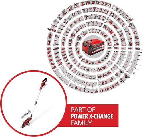 | Features | Die Einhell Akku-Gras- und Strauchschere GE-CG 18/100 Li T-Solo ist ein leistungsstarkes Mitglied der cleveren Power X-Change-Familie. Akkus können innerhalb der Systemfamilie flexibel untereinander kombiniert werden, Zum Betrieb der Gras- und Strauchschere ist 1x 18 Volt PXC-Akku notwendig. Akku und Ladegerät sind nicht im Lieferumfang enthalten und sind separat erhältlich, zum Beispiel als praktisches Starter-Set in verschiedenen Stärken, Der Messerwechsel von Scherenmesser und Schneideblatt erfolgt ganz einfach und werkzeuglos. Das Grasschneideblatt der Akku-Gras- und Strauchschere ist perfekt zur Pflege von Rasenkanten geeignet, Für die akkurate Hecken- und Buschpflege sind die lasergeschnittenen und diamantgeschliffenen Strauchscherenmesser mit 200 mm Schnittlänge und 8 mm Schnittstärke ideal, Im Einsatz bietet der Softgrip perfekten Halt und Ergonomie bei jeder Bewegung. Im Lieferumfang enthalten ist eine Teleskopverlängerung für eine besonders ergonomische Anwendung, Das abgedeckte Getriebegehäuse schützt im Einsatz und bei der Säuberung vor Berührungspunkten von Bauteilen, die mit Getriebeöl geschmiert sind |