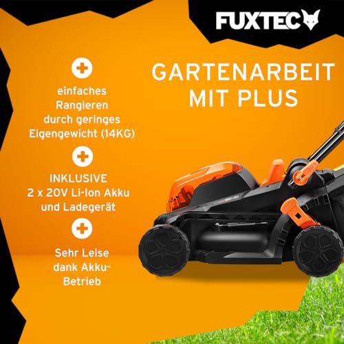 - Akku-Rasenmäher 40V (2x20V) von FUXTEC mit zwei Lithium-Ionen-Batterien und einem Doppel-Ladegerät.