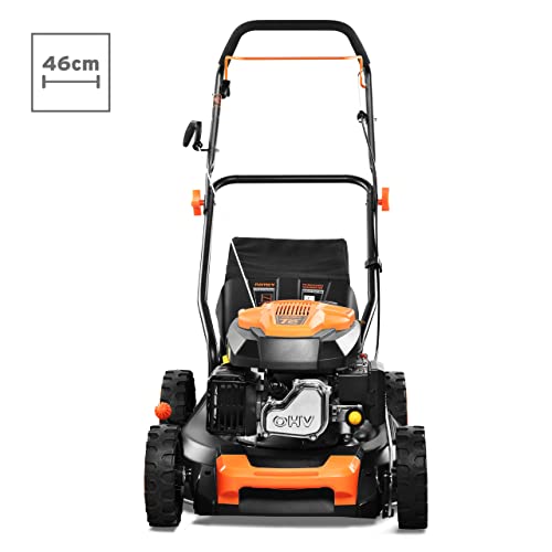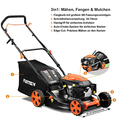 FUXTEC 3in1 Benzin Rasenmäher FX-RM4646ECO 3,5PS / 2,6kW | 46cm Schnittbreite & 7-stufige Schnitthöhenverstellung 25-75mm| 4-Takt Mäher – Inkl. 50L Grasfangkorb, Mulchfunktion & Reinigungsanschluss
