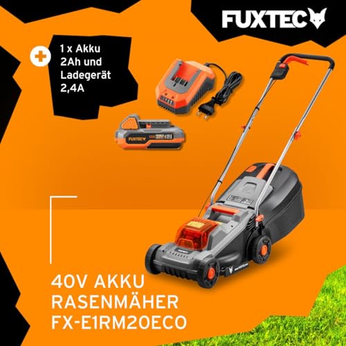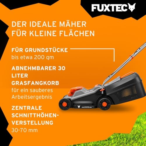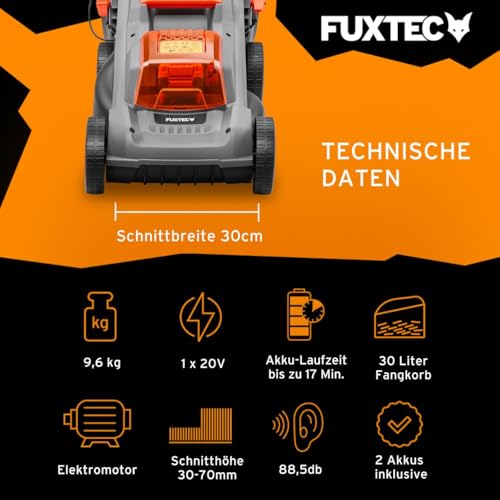 Fuxtec 20 V Akku-Rasenmäher FX-E1RM20-ECO-SET inkl. Akku + Ladegerät, Rasenmäher für kleine bis mittlere Gärten, Schnittbreite 30 cm, 30L Grasfangkorb, Schnitthöhe 30-70 mm