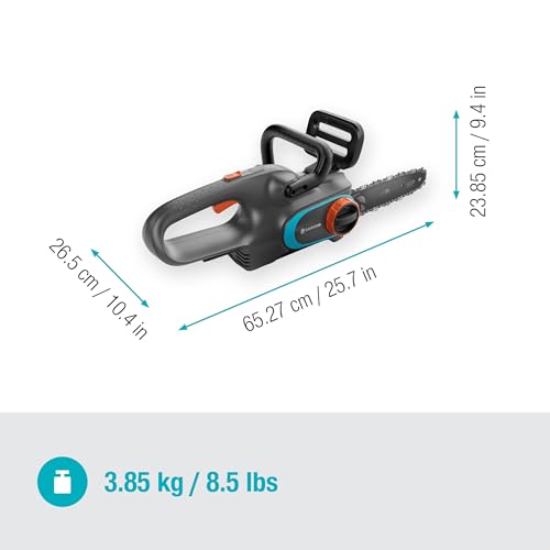 | Features | Ideal für Baumpflege, Brennholzvorbereitung, Hobbygärtnern: Teilung: 3/8" Niedrigprofil. Stärke: 1,1 mm schmal, Präzise Schnittqualität: Die wärmebehandelte Präzisions-Halbmeißelkette schneidet gleichmäßig, Hohe Sicherheit: Kettenbremse und Kettenfänger zur Vermeidung von Verletzungen im Falle eines Kettenbruchs, Lange Lebensdauer: Das LubriTec-Ölsystem hält Kette und Schwert stets geölt – für weniger Reibung, Lieferumfang: 1x Gardena Kettensäge PowerSaw 250/18V, 1x System-Akku P4A PBA 18V/72, 1x Ladegerät P4A AL 18V-20 CV |