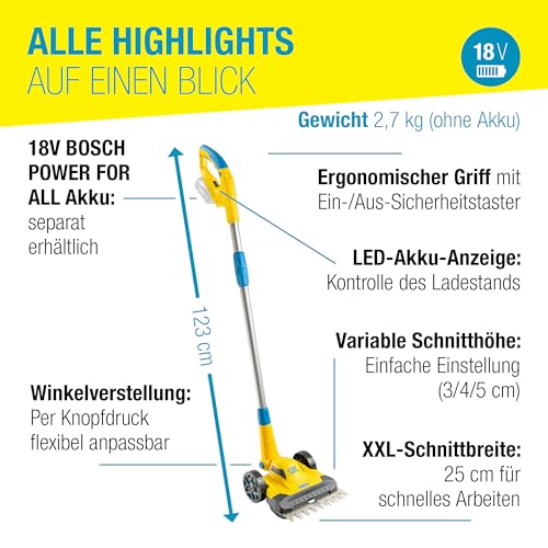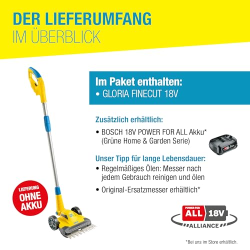 | Features | BESTER FREUND DES RASENROBOTERS: Der Akku Rasen- und Kantenschneider FineCut 18V ist die ideale Ergänzung zu jedem Mähroboter im heimischen Garten. Restliches Gras, welches der Robotermäher stehen lässt, kann bequem mit dem FineCut 18V gekürzt werden., BESTER SCHNITT: Dank Doppelmessersystem werden die Grashalme nicht abgerissen oder abgeschlagen, sondern fein säuberlich, nach dem Scherenprinzip, abgeschnitten. Für ein optisch ansprechendes Ergebnis wie auf dem Golfplatz!, XXL-SCHNITTBREITE: Effizientes Arbeiten mit maximaler Fläche. Das 25 cm breite Messer erspart zusätzliche Arbeitswege und kann bis dicht an den Rand schneiden. Das Gerät ist auch geeignet für den gesamten Rasenschnitt von kleineren Rasenflächen., EINSTELLBARER HOLMWINKEL: Der einstellbare Holmwinkel lässt das Gerät auch tief unter Büschen, Sträuchern oder Kinderspielgeräten im Garten schneiden. Einfach per Knopfdruck arretierbar und bestens an die Körpergröße anpassbar., BOSCH AKKU-POWER: GLORIA ist Teil der Bosch 18V POWER FOR ALL Allianz. Ein Akku passt auf viele Geräte. Das spart nicht nur Platz sondern auch Kosten und schont nebenbei die Umwelt. Die Akkulaufzeit des FineCut 18V beträgt 60 Minuten (2.5 Ah Akku)., LIEFERUMFANG: 1 x FineCut 18V, 0 x Akku, 0 x Ladegerät |