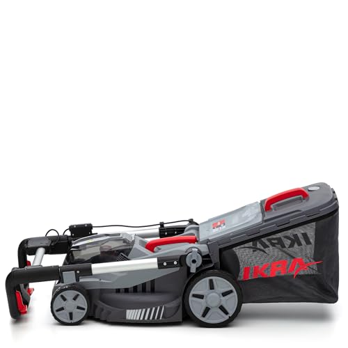 IKRA Akku-Rasenmäher: Für 400m² geeignet, bietet er kabelloses Mähen mit 38cm Schnittbreite. Genieße einfache Handhabung dank leichtem, kompaktem Design. Mähen, fangen und mulchen möglich, ideal für pflegeleichte Rasenpflege. Akku separat erhältlich.