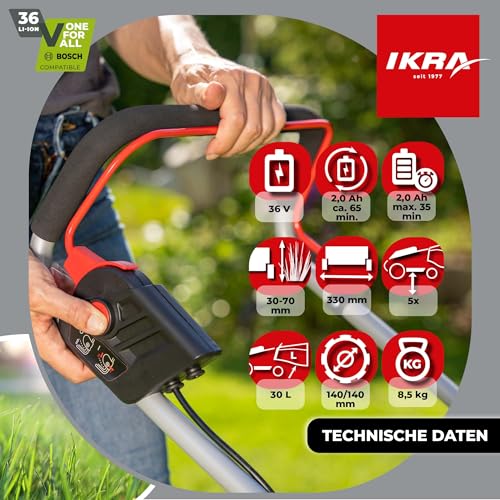 IKRA Bosch 36V Akku Rasenmäher IB-LM 33, Rasenflächen bis 250m², Schnittbreite 33cm, Schnitthöhe 30-70mm, ohne Akku & Ladegerät