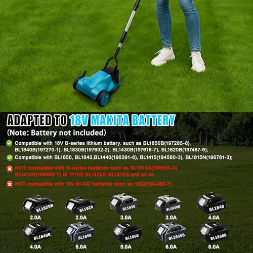 | Features | Kompatibel mit: Ohne Akku und Ladegerät. Akku bohrer kompatibel mit Makita 18V Akkus, wie BL1820 BL1820B BL1830 BL1830B BL1840 BL1840B BL1850 BL1850B BL1860 BL1860B, etc. 3AH-Batterie kann 20-25 min funktionieren., Einstellbare Schnitthöhe: Die angepasste Schnitthöhe beträgt 26/41/56 mm, und Sie können die ideale Rasenhöhe für Ihren Garten auswählen, um Ihren Rasen ordentlich und schön zu halten., Leistungsstarker Bürstenloser Motor: Der bürstenlose Motor des kabellosen akkurasenmäher gewährleistet eine hohe Effizienz, die Kosten für die Wartung und die hohe Zuverlässigkeit und ermöglicht eine reibungslose und genaue Geschwindigkeitsanpassung., Leicht und flexibel: Der Rasenmäher mit einem tragbaren Design und einem rotierenden Griff ist einfach zu bedienen. In jeder Ecke, beispielsweise unter Büschen und Bänken, ist die Wartung von Garten sehr einfach., Leichter Mäher für kleine Flächen: Das 21 cm lange Mulchmesser zerkleinert den Rasenschnitt zu feinem Schnittgut. Akkurasenmäher Ist ideal für kleinere Gärten bis zu 50 m² Mähfläche |