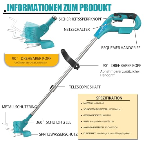 Erlebe müheloses Rasenmähen mit dem leichten Akku-Rasentrimmer von JUTOSGSKW. Leistungsstarker Motor, multifunktionale Klingen und drehbarer Schneidkopf machen die Gartenarbeit effizient und sicher. Ideal für präzises Trimmen, kompatibel mit Makita 18 V Akku.