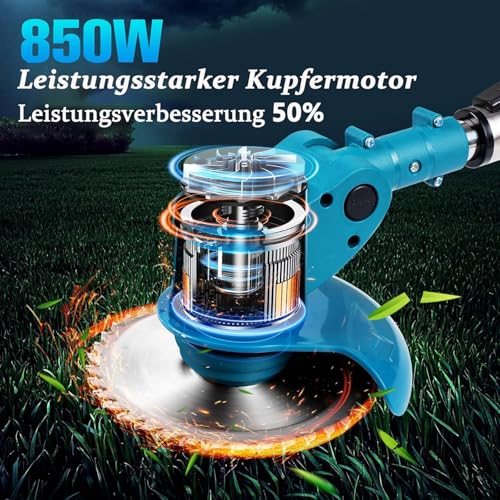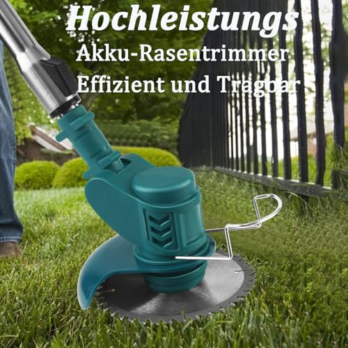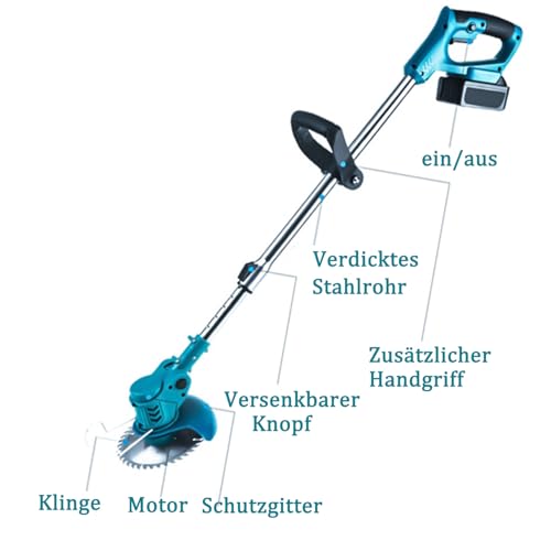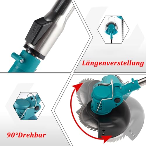 | Features | Leistungsstarker Akku Rasentrimmer: Elektrischer Unkrautstecher mit 850W Hochleistungsmotor aus reinem Kupfer, 20000 U/min Leerlaufdrehzahl, macht die Schneidarbeit effizienter. Der Akku-Unkrautstecher ist mehrere Funktionen in einem: Rasentrimmer, Rasenkantenstecher, kleiner Rasenmäher, einfach für verschiedene Schneidarbeiten, nicht durch Drähte begrenzt, Sie können überall mähen., 21V Rasentrimmer mit Akku: Dieser akkubetriebene Unkrautstecher wird mit 2 großvolumigen 4000mAh-Akkus und einem Ladegerät geliefert, wobei jeder Akku bis zu 40 Minuten Dauerbetrieb ermöglicht. Da die beiden Akkus abwechselnd arbeiten, müssen Sie sich keine Sorgen über Ausfallzeiten machen. Genießen Sie die Freiheit des kabellosen Trimmens., 4 Arten von Schneidklingen: Der akku rasenmäher ist mit 4 Arten von Schneidklingen ausgestattet: Sägeblätter zum Schneiden dickerer Sträucher, Äste und Schösslinge. Metallklingen zum Schneiden von dickem Unkraut und kleinen Sträuchern. Nylonklingen zum Schneiden von frischem Gras und Rasenflächen. Wenn Ihr Gartengras sehr üppig ist, empfiehlt es sich, direkt eine Metallklinge zu verwenden., Höhenverstellbarer und drehbarer Kopf: Der wiederaufladbare Unkrautstecher verfügt über einen verstellbaren Teleskopstab, der sich von 84 cm auf 120 cm ausdehnen lässt, so dass Benutzer unterschiedlicher Körpergröße sich nicht bücken müssen. Der Neigungswinkel des Kopfes lässt sich von 0° bis 90° einstellen, was eine bequeme Bedienung ermöglicht und die Belastung von Hüfte und Schultern verringert., Sicheres und praktisches Design: Der akku-rasentrimmer verfügt über eine Sicherheitstaste, die ein versehentliches Einschalten verhindert. Er muss durch gleichzeitiges Drücken der Sicherheitstaste und des Schalters aktiviert werden. Er ist ein zuverlässiger und effizienter Helfer für alle Ihre Trimmarbeiten. |
