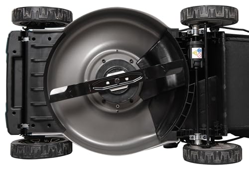 Das Design des Geräts ist nicht nur funktional, sondern auch ästhetisch ansprechend. Die Kombination aus Schwarz und Petrol verleiht dem Rasenmäher ein modernes Erscheinungsbild.