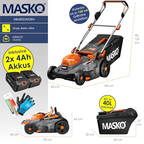 MASKO® Akku Rasenmäher mit Mulchfunktion, 2X Akkus Li-Ion Batterie 4Ah & Doppel-Ladegerät Rasentrimmer 37cm Schnitt-Breite 6X Höhenverstellbar 40L Fangkorb Flächen bis 600m² inkl. Handschuhe & Bürste