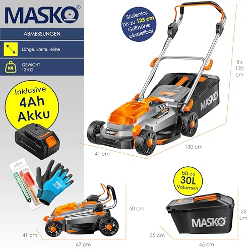 MASKO® Akku Rasenmäher mit Mulchfunktion, Akku Li-Ion Batterie 4Ah & Ladegerät Rasentrimmer 33cm Schnitt-Breite 5X Höhenverstellbar 30L Fangkorb Flächen bis 150m² inkl. Handschuhe & Bürste