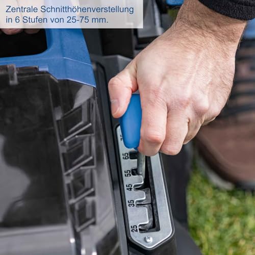 Die Schnitthöhenverstellung in sechs Stufen von 25 bis 75 mm erlaubt es dir, die Schnitthöhe je nach Bedarf anzupassen. Diese Funktion ist besonders hilfreich, um unterschiedliche Rasentypen optimal zu schneiden.