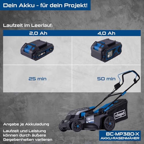 Scheppach Akku-Rasenmäher BC-MP380-X 20V Brushless Akkumäher | 38cm Schnittbreite | für 450-500 m2 | Schnitthöhenverstellung von 25–75mm | 45L Korb | 20V-IXES-Serie | mit 2x 4Ah Akku & Doppelladegerät