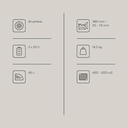 | Features | Leistungsstarker Akku-Rasenmäher mit 38 cm Schnittbreite, Flexibilität dank einheitlichem Akku-System – ein Akku für gesamte gomag 20 V Serie, Wartungsfreier Brushless Motor – langlebiger, bürstenloser Motor mit hohem Wirkungsgrad, längerer Laufzeit dank geringem Verschleiß, Kraftvolle 2x 20 V, Zentrale Schnitthöhenverstellung in 6 Stufen von 25 – 75 mm, Ergonomischer Komforthandgriff sorgt für geringere Vibrationen, 45 L Fangbox mit Füllstandsanzeige, Robustes Gehäuse mit integriertem Tragegriff für einfachen Transport, Batteriefach mit Sicherheitsschlüssel und klappbarer Schutzhaube, Inklusive 2x 4Ah Akku & 2xLadegerät |