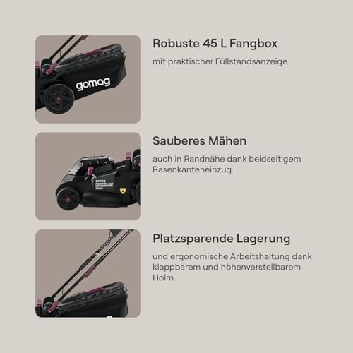 Die Benutzerfreundlichkeit des Gomag Rasenmähers ist einer seiner großen Vorteile. Der ergonomische Komforthandgriff reduziert Vibrationen und ermöglicht ein angenehmes Arbeiten über längere Zeiträume. Dieser Aspekt ist besonders wichtig für Nutzer, die Wert auf Komfort legen, um Ermüdung zu vermeiden.