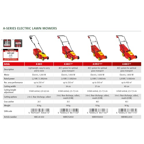 Der WOLF-Garten Elektro-Rasenmäher A 370 E ist eine ausgezeichnete Wahl für Gartenliebhaber, die einen leistungsstarken und benutzerfreundlichen Rasenmäher suchen. Er bietet genügend Leistung für mittelgroße Rasenflächen und erweist sich als zuverlässiger Helfer im Garten. Dank seiner ergonomischen Bauweise und der effizienten Kabelführung macht die Gartenarbeit mit diesem Mäher wieder Spaß.