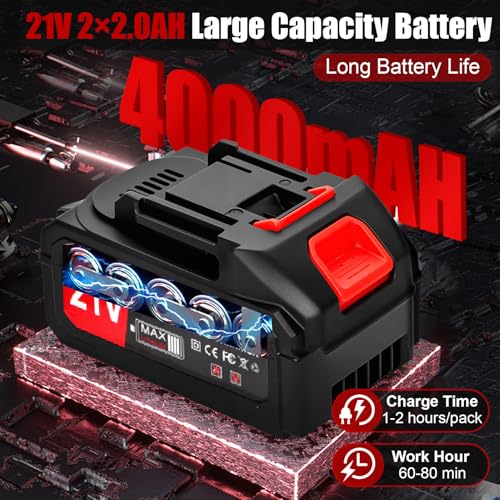 - Kommt mit 2 x 4,0 Ah Akkus, die 60–90 Minuten Einsatzzeit bieten