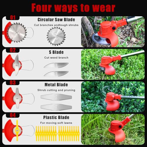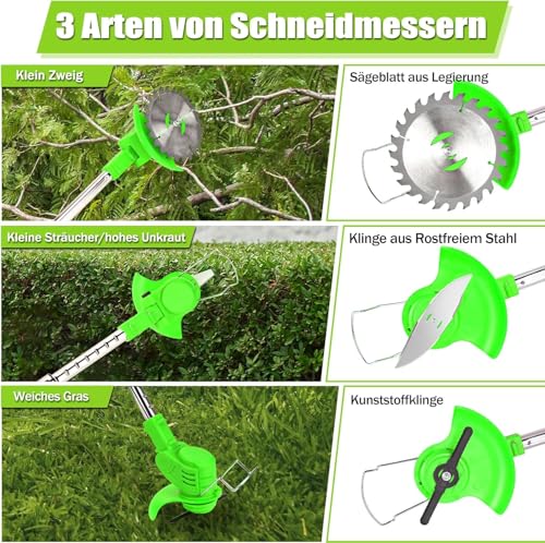 Die drei Arten von Klingen erleichtern den vielseitigen Einsatz und ermöglichen es, sowohl zartes Gras als auch dickere Sträucher effektiv zu bearbeiten. Dies bietet Flexibilität und Anpassungsvermögen für verschiedene Gartenszenarien.