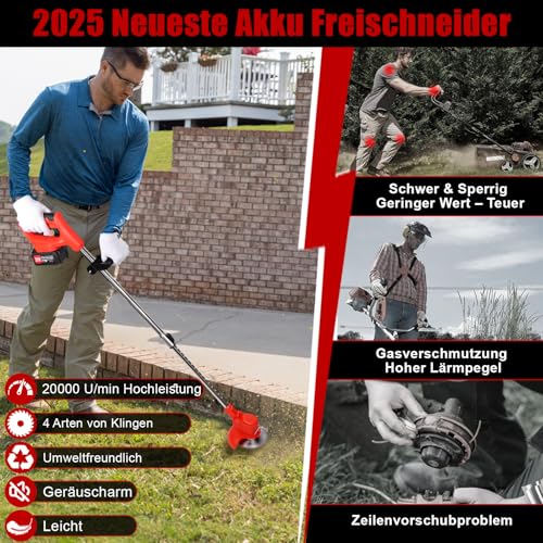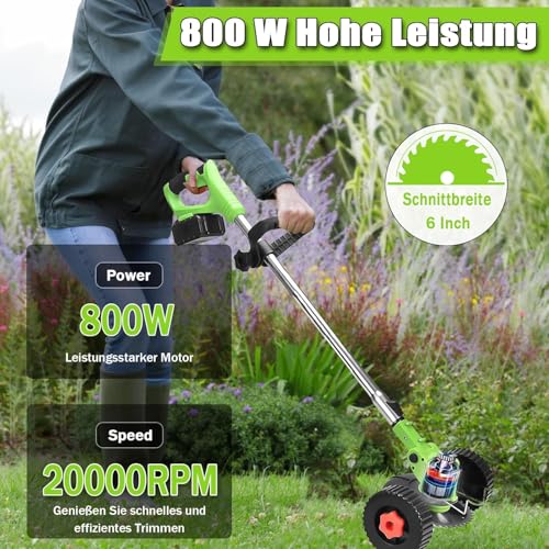 | Features | 【Vielseitiger Akku Freischneider】: Der Motorsense Akku ist mit 3 Messertypen ausgestattet, die mit unterschiedlichen Szenarien problemlos zurechtkommen. ①Metallklingen eignen sich zum Trimmen von dichtem Unkraut und Hecken; ②Sägeblätter eignen sich zum Trimmen von Sträuchern; ③Kunststoffklingen eignen sich nur zum Schneiden von zartem Gras. Wenn Ihr Gartengras dicht ist, empfiehlt sich die direkte Verwendung eines Metallmessers (bitte wählen Sie beim Unkrautjäten die entsprechende Klinge)., 【2 x 4,0 Ah Freischneider Akku】: Dieser akku trimmer ist mit 2 leistungsstarken 4,0 Ah-Akkus (Statt 2,0Ah),Eine 4,0-Ah-Batterie kann 60–90 Minuten lang ununterbrochen zum Mähen und Unkrautjäten verwendet werden; die Ladezeit beträgt ca. 3-4 Stunden(bitte laden Sie die Akkus zuerst vollständig auf, wenn Sie das Paket erhalten). Dies wird Ihnen helfen, mehr Unkraut in Ihrem Garten zu schneiden.Tragbarer als ein kabelgebundener Rasenmäher. (Die Akkulaufzeit variiert je nach Vegetationsdichte)., 【Leistungsstark und Leicht】: Dieser akku motorsense ist mit einem 850W Hochleistungsmotor aus reinem Kupfer ausgestattet. Wiegt nur 4.5 Pfund und ist mit Rädern ausgestattet, sodass er für Frauen und Senioren einfach zu bedienen ist. Der Akku-Rasentrimmer verfügt über eine verstellbare Teleskopstange, zwischen 95 und 125 cm eingestellt werden kann,ohne sich bücken zu müssen. Der Kopfwinkel lässt sich zwischen 0 und 90° verstellen. Jede Steigung und Engstelle meistern Sie problemlos., 【Sicheres Design, Zuverlässiger】: Unser grass trimmer wurde professionell entwickelt und auf Sicherheit geprüft. Durch die Doppelschalter-Sicherheitsverriegelungsfunktion kann die Gefahr eines unbeabsichtigten Einschaltens wirksam vermieden werden. Durch die kollisionssichere Metallstange können Blumen oder Zierpflanzen beim Unkrautjäten geschützt werden. Durch die Schutzblende kann ein Herausspritzen des Schnittguts wirksam verhindert werden(Vermeiden Sie beim Rasenmähen Wände)., 【Einfach zu Rnstallieren, 2 Jahre Garantie】 Dieses akku rasentrimmer mit rädern einfach zu installieren. Zum Zubehör gehören: 1 Rasentrimmer, 2 Lithiumbatterien, 1 Ladegerät, 1Metallkreissägeblätter, 20 Kunststoff-Trimmblätter, 4 Metall-Trimmblätter, 1 Paar Handschuhe, 1 Schutzbrille, 1 Griff, 1 Grasschutz, 1 Antikollisions-Eisenstange, 1 Bedienungsanleitung. Wir bieten außerdem eine 2-jährige Garantie. Wenn Sie Fragen zum Produkt haben, kontaktieren Sie uns bitte. |