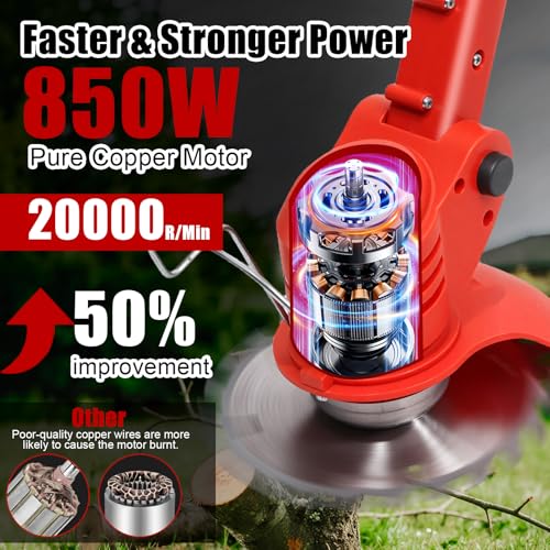 Der 850W Motor aus reinem Kupfer bietet beeindruckende Kraft, um durch dichte Vegetation zu schneiden. Dieses Merkmal macht den Rasentrimmer besonders geeignet für große und anspruchsvolle Gärten mit dichtem Unkraut oder Hecken.