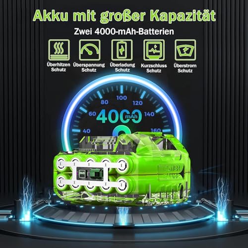 Die zwei mitgelieferten 4,0 Ah Akkus bieten eine Betriebsdauer von bis zu 90 Minuten und sind damit ideal für mittelgroße bis große Grundstücke. Der Drahtlosvorteil gegenüber kabelgebundenen Geräten ist klar, besonders in schwer zugänglichen Gartenecken.