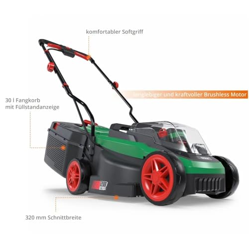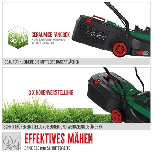 | Features | EFFIZENTER MOTOR: Ausgestattet mit einem langlebigen, bürstenlosen Motor, bietet der Güde Akku-Rasenmäher 330/20-4 mehr Leistung und eine längere Laufzeit, ideal für das Mähen von Rasenflächen bis zu 1300 m², ANPASSBARE SCHNITTHÖHE: Mit seiner komfortablen, 3-fachen zentralen Schnitthöhenverstellung ermöglicht dieser Mäher eine präzise Anpassung an die Bedürfnisse Ihres Rasens., BENUTZERFREUNDLICH: Der ergonomisch geformte Führungsholm, kombiniert mit einem Softgriff mit komfortabler Schaltereinheit, sorgt für ein angenehmes Handling während der Gartenarbeit., INNOVATIV: Der 30-Liter half/half Grasfangsack mit sichtbarer Füllstandanzeige und der praktische Mulchkeil erleichtern die Rasenpflege und fördern eine natürliche Nährstoffversorgung, AKKU UND SICHERHEIT: Ein leistungsstarker 20 V / 4 Ah Li-Ion Akku sorgt für ausdauernde Leistung, während das 2,6-Stunden-Ladegerät schnelle Ladevorgänge ermöglicht und der Sicherheitsschlüssel ein versehentliches Einschalten des Motors verhindert. |