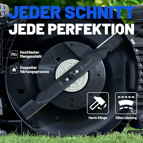 - Mit einer Schnittbreite von 43 cm und einer einstellbaren Schnitthöhe von 25 bis 75 mm bietet der Mäher Vielseitigkeit für unterschiedliche Rasentypen und -bedingungen.