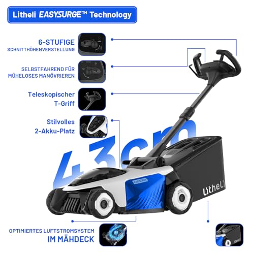 Litheli Easysurge Akku Rasenmäher, 40V/43cm Schnittbreite, Selbstfahrend (2,2-4,7 km/h), Bürstenloser Motor, bis 500 m², 50L Fangkorb, 25-75 mm Schnitthöhe, inkl. 2 x 4,0 Ah Akkus