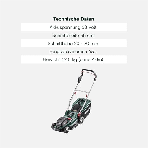 Der Metabo Akku-Rasenmäher RM 36-18 LTX BL 36 ist eine interessante Option für Gartenliebhaber, die nach einem leistungsstarken und dennoch flexiblen Mähgerät suchen. Mit seinem modernen Design und der Mulchfunktion richtet sich dieser Mäher an Nutzer, die Wert auf Effizienz und Nachhaltigkeit legen. In dieser Bewertung erfährst du mehr über die technischen Details und erhältst einen Überblick über die Vor- und Nachteile dieses Produkts.
