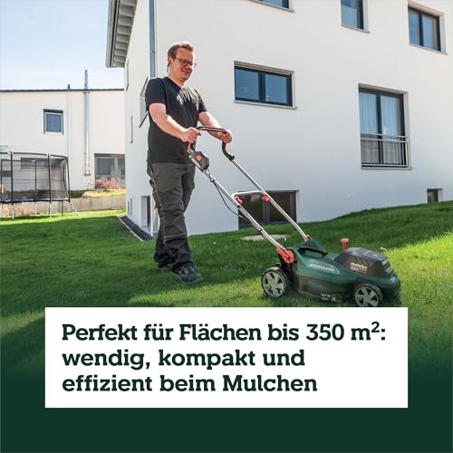 - Leichter, wendiger Akku-Rasenmäher mit einer Schnittfläche bis zu 350 m²