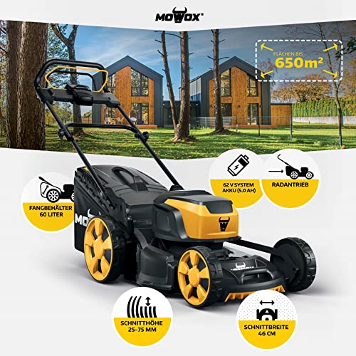 Mowox EM 4662 S-Li Akku-Rasenmäher mit Stahlgehäuse, Radantrieb, 3in1 Funktion, 60l Fangsack mit Hard-Top und Füllstandsanzeige, zentrale Höhenverstellung, kugelgelagerte Räder, EASY2STORE-Funktion