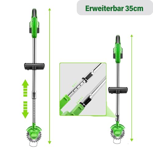 | Features | 【Vielseitige Klingen】Unser Freischneider Akku überzeugt mit 4 Klingen für jeden Einsatz: 2 robuste 6-Zoll-Metallklingen für Äste und Büsche, weitere 6-Zoll-Metallklingen für Unkraut & dickes Gras sowie 10 präzise Kunststoffklingen für perfekte Rasenkanten. Ideal für Garten, Weiden oder Hofrasen – ein kraftvoller Allrounder!, 【Freischneider Akku mit 2 Akkus】 Unser kabelloser Freischneider Akku inkl. 2x 2000-mAh-Lithium-Akkus (je 45 Min. Laufzeit) und Ladegerät löst das Problem kurzer Betriebszeiten. Dank Wechselakkus arbeiten Sie ohne Pause – kein Kabelsalat, kein Warten aufs Laden!, 【Ergonomisches Design】Unser Freischneider Akku überzeugt mit verstellbarer Teleskopstange (35,4-50 Zoll) für flexible Arbeitshöhen. Das leichte Design sorgt für hohen Komfort und Effizienz – ideal für alle Nutzer. Perfekt für präzises Arbeiten ohne Ermüdung!, 【90°-Schneidkopf und Sicherheit】Der kabellose Rasentrimmer verfügt über einen 90°-Schneidkopf, der sich flexibel in verschiedenen Winkeln einsetzen lässt. Zusätzlich schützt eine 150°-Schutzabdeckung effektiv vor herausspritzendem Gras. Für den Start des Geräts müssen Sie zunächst den Anti-Fehlbedienungsschalter betätigen und anschließend den Startschalter drücken. Dieses Sicherheitsfeature verhindert eine versehentliche Nutzung und gewährleistet maximale Sicherheit., 【Einfache Installation】Räumen Sie Ihren Garten mühelos mit unserem Grass Cutter auf. Das Set beinhaltet: 1 x Rasentrimmer, 2 x Lithium-Akku, 1 x Schnellladegerät, 2 x 6-Zoll-Metall-Kreissägen, 10 x Kunststoffklinge, 4 x 6-Zoll lange gerade Metallklinge, 1 x Schraubenschlüssel-Set, 1 x Handschuhe, 1 x Schutzbrille, 1 x Griff, 1 x Grasschutz, 1 x stoßfeste Eisenstange, 1 x Anleitung. Zusätzlich bieten wir eine 1-Jahres-Garantie. Bei Fragen zum Produkt zögern Sie bitte nicht, uns zu kontaktieren – wir helfen Ihnen gerne weiter! |